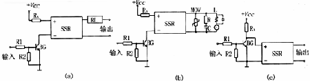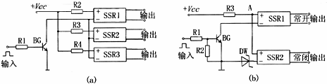 图5 通常SSR均设计为“常开”状态,即无控制信号输入时,输出端是开路的,但在自动化控制设备中经常需要“常闭”式的SSR,这时可在输入端外接一组简单的电路,如图5c所示,这时即为常闭式SSR。 2、多功能控制电路 图6a为多组输出电路,当输入为“0”时,三极管BG截止,SSR1、SSR2、SSR3的输入端无输入电压,各自的输出端断开;当输入为“1”时,三极管BG导通,SSR1、SSR2、SSR3的输入端有输入电压,各自的输出端接通,因而达到了由一个输入端口控制多个输出端“通”、“断”的目的。 图6b为单刀双掷控制电路,当输入为“0”时,三极管BG截止,SSR1输入端无输入电压,输出端断开,此时A点电压加到SSR2的输入端上(UA-UDW应使SSR2输出端可靠接通),SSR2的输出端接通;当输入为“1”时,三极管BG导通,SSR1输入端有输入电压,输出端接通,此时A点虽有电压,但UA-UDW的电压值已不能使SSR2的输出端接通而处于断开状态,因而达到了“单刀双掷控制电路”的功能(注意:选择稳压二极管DW的稳压值时,应保证在导通的SSR1“+”端的电压不会使SSR2导通,同时又要兼顾到SSR1截止时期“+”端的电压能使SSR2导通)。