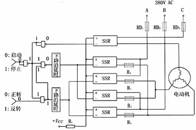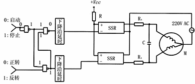 图7 计算机控制单相交流电机正反转的接口及驱动电路 为了限制电机换向时电容器的放电电流,应在各回路中外加一只限流电阻Rx,其阻值和功率可按下式计算: Rx=0.2×VP/IR(Ω), P=Im2Rx 其中:VP—电源峰值电压(V);IR—固态继电器额定电流(A);Im—电机运转电流(A);P—限流电阻功率(W) 图8计算机控制三相交流电机正反转的接口及驱动电路,图中采用了4个与非门,用二个信号通道分别控制电动机的起动、停止和正转、反转。当改变电动机转动方向时,给出指令信号的顺序应是“停止—反转—起动”或“停止—正转—起动”。延时电路的最小延时不小于1.5个交流电源周期。其中RD1、RD2、RD3为熔断器。当电机允许时,可以在R1-R4位置接入限流电阻,以防止当万一两线间的任意二只继电器均误接通时,限制产生的半周线间短路电流不超过继电器所能承受的浪涌电流,从而避免烧毁继电器等事故,确保安全性;但副作用是正常工作时电阻上将产生压降和功耗。该电路建议采用额定电压为660 V或更高一点的SSR产品。